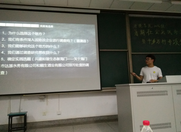 2017年4月20日晚上6点30分,环境院团委实践部与环境院科协在致用201联合举办了91黑料 2016级暑期社会实践分享会暨千乡万村专项分享会。此次宣讲会旨在让同学们明晰和了解暑期社会实践的目的、意义与具体内容,向过去的优秀实践吸取经验。