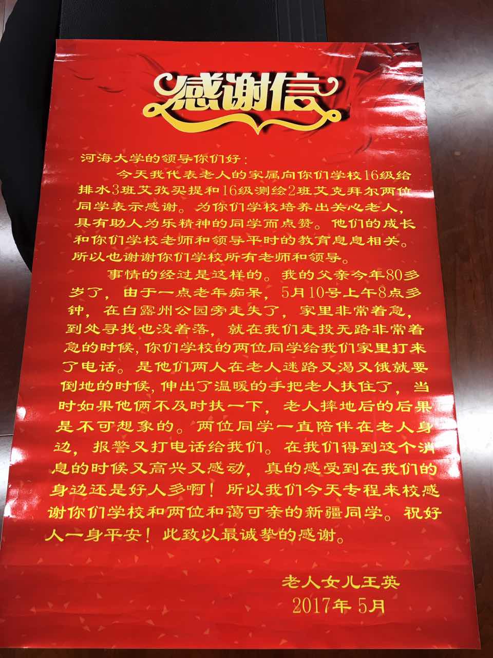 事情的经过是这样的。我的父亲今年80多岁了,由于一点老年痴呆,5月10号上午8点多钟,在白露州公园旁走失了,家里非常着急,到处寻找也没着落,就在我们走投无路非常着急的时候,你们学校的两位同学给我们家里打来了电话。是他们两人在老人迷路又渴又饿就要倒地的时候,伸出了温暖的手把老人扶住了,当时如果他俩不及时扶一下,老人摔地后的后果是不可想象的。两位同学一直陪伴在老人身边,报警又打电话给我们。在我们得到这个信息的时候又高兴又感动,真的感受到在我们的身边还是好人多啊!所以我们今天专程来校感谢你们学校和两位和蔼可亲的新疆同学。祝好人一生平安!此致以最诚挚的感谢。