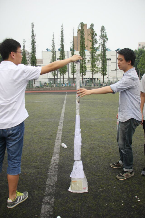 第二个游戏叫“运筹帷幄,共建高楼”,每组要求在10分钟内,利用分配到的报纸和胶带尽可能建造最高的高楼,最后以能保持1分钟不倒且高度最高为优胜。一声号令下,各组围聚在一起讨论高楼的建造设计,有效分工,合力完成任务。最后第三小组的高楼以167cm的高度稳夺第一。