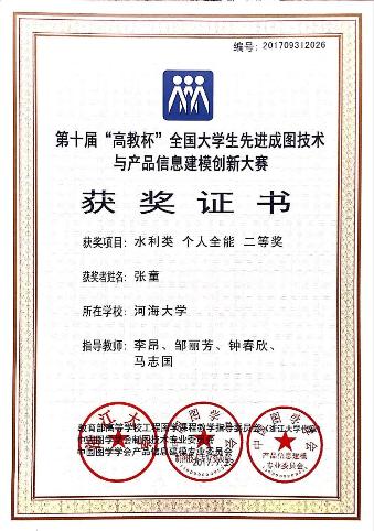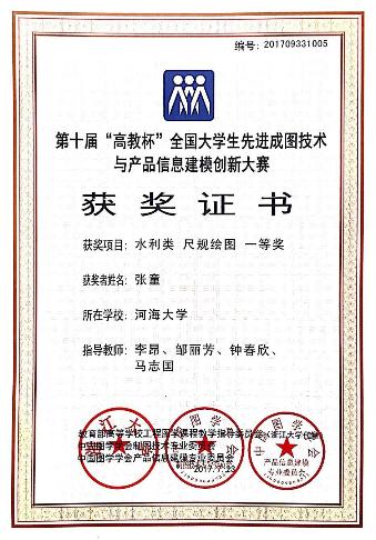 由教育部高等学校工程图学教学指导委员会和中国工程图学学会制图技术专业委员会联合举办的第十届“高教杯”全国大学生先进成图技术、产品信息建模创新大赛于2017年7月21日~24日在兰州交通大学举办。91黑料 2015级给排水科学与工程专业张童同学积极参与,经过选拔和培训,在港航院老师的指导下,荣获水利类尺规绘图一等奖,水利类个人全能二等奖以及水利类团体一等奖的好成绩。