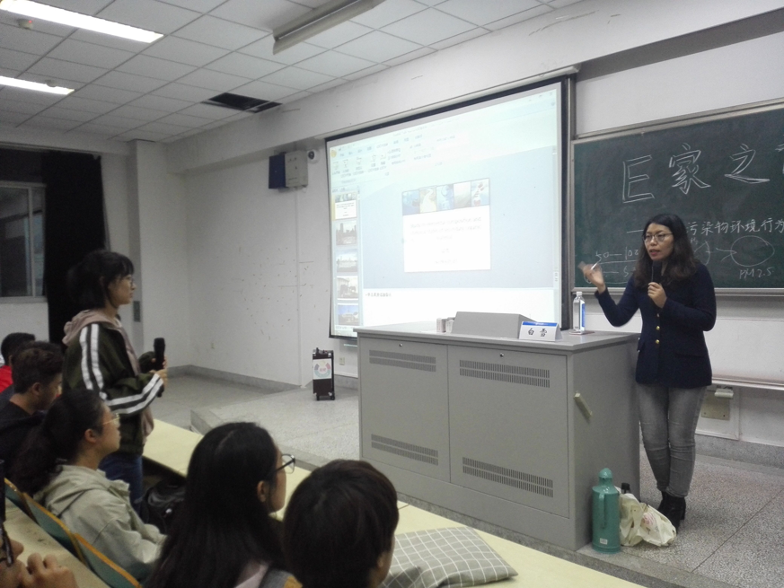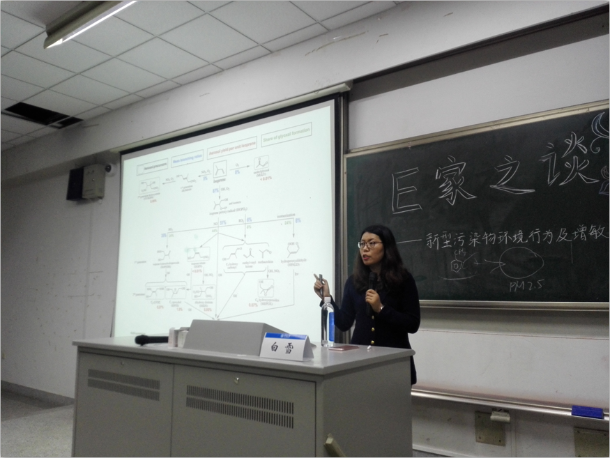 接着,白教授主要从纳米污染物环境行为、新兴污染物环境行为及典型污染物催化降解等多个方面为同学们详尽地介绍了二次有机污染物及多种环境污染行为,具体为同学们列举了检测电极、检测传感器及环境监测的多种方法。