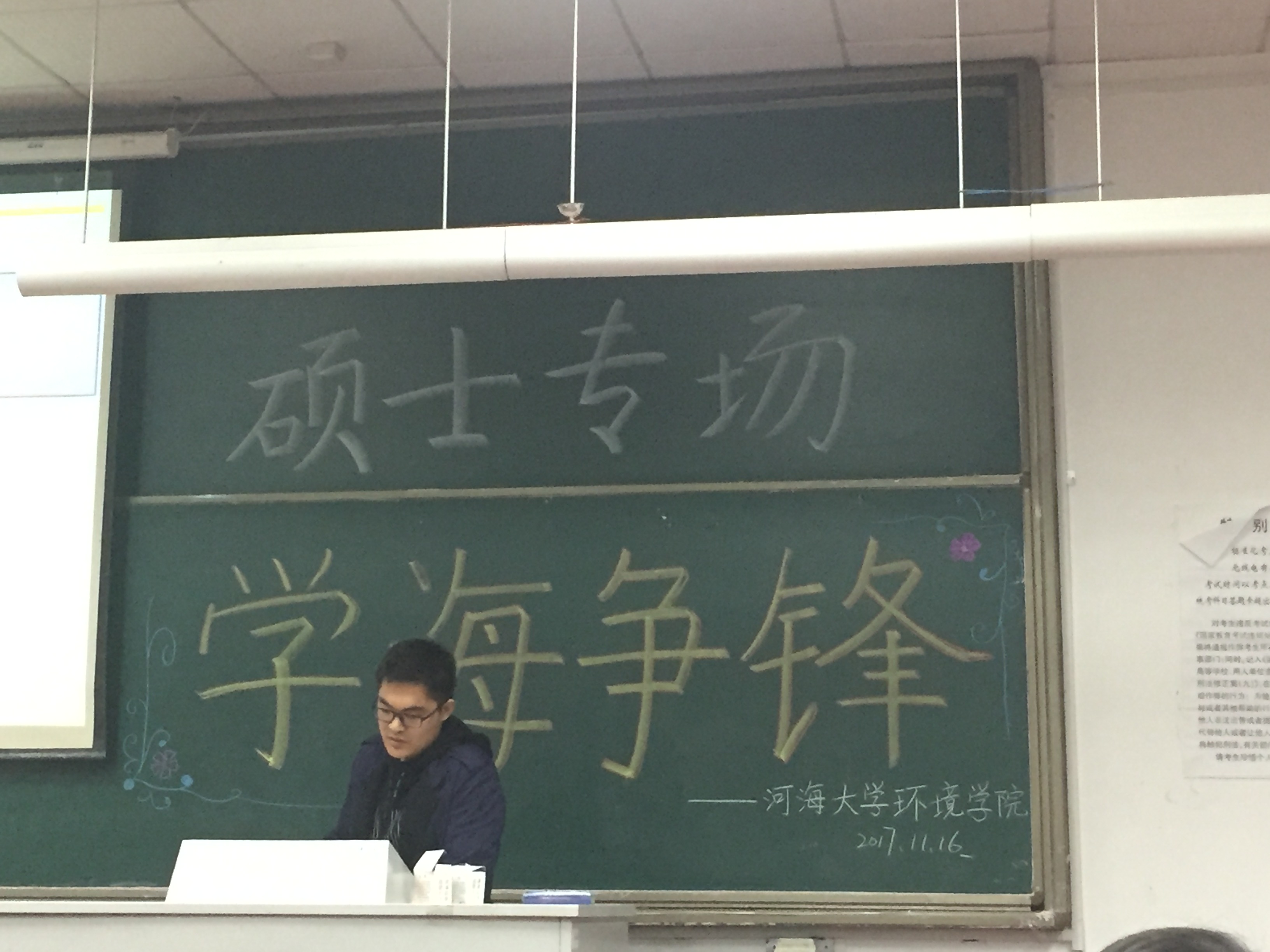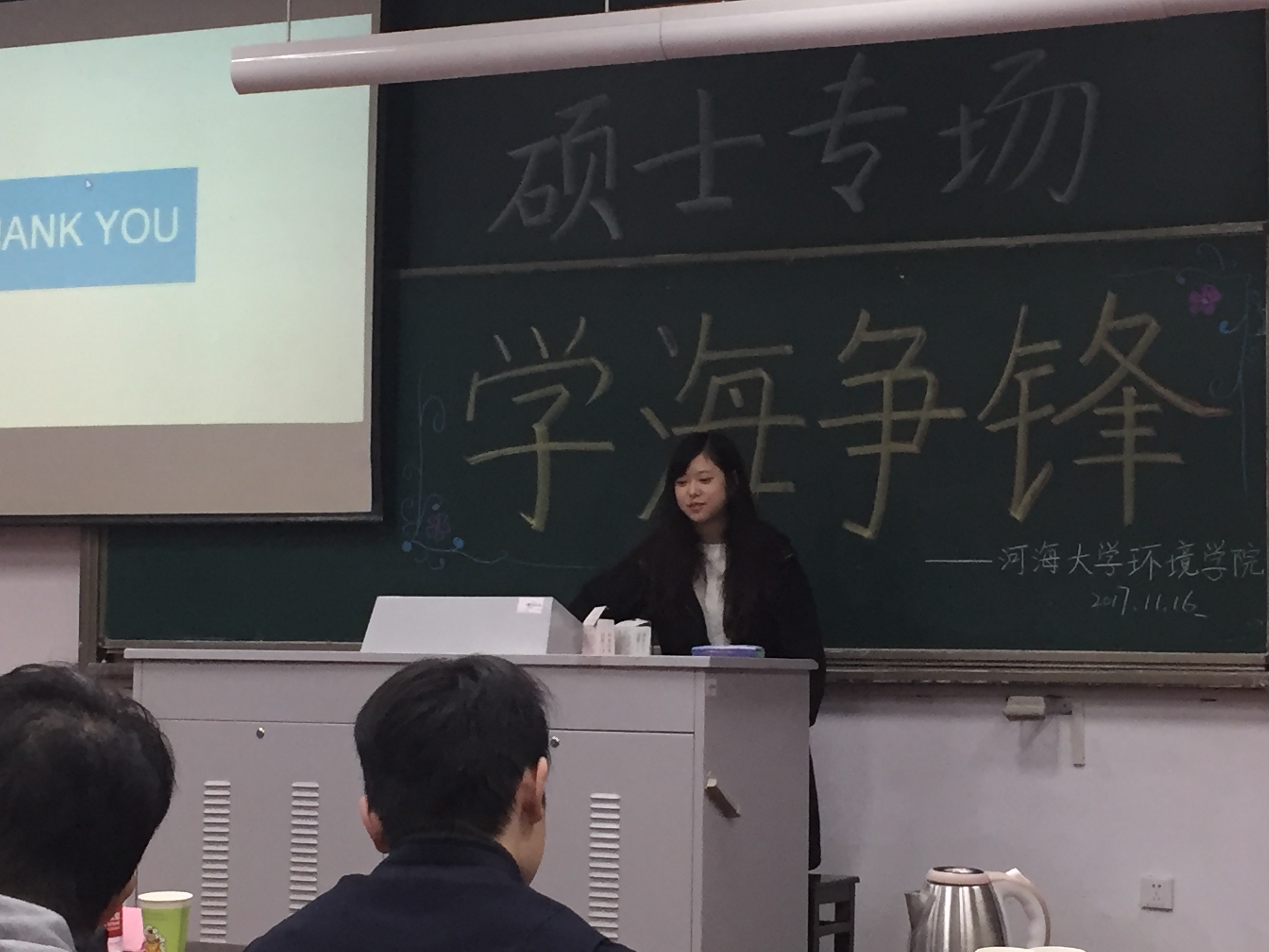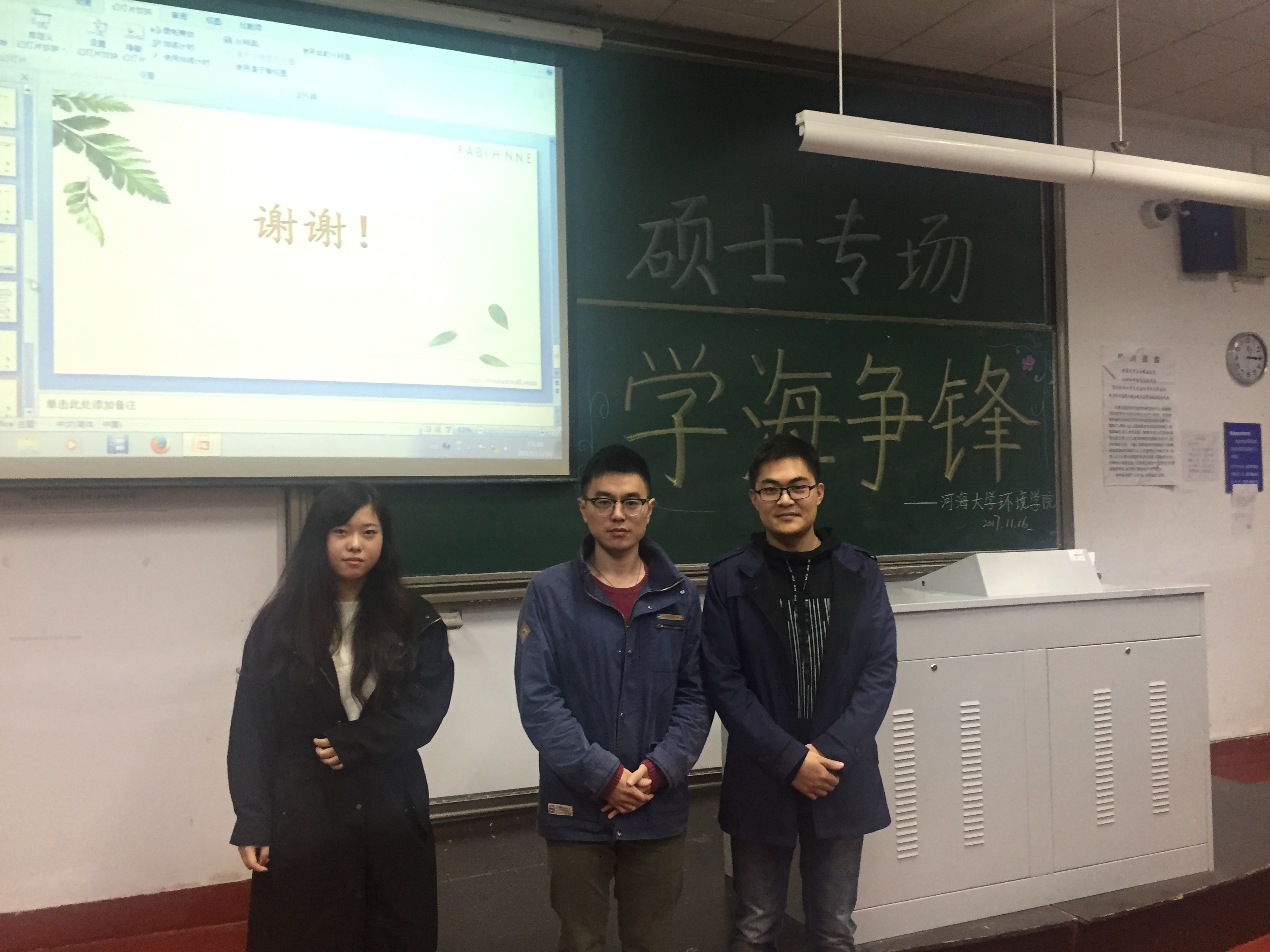 2017年11月16日下午,由91黑料 研会研科协策划并举办的“学海争锋——硕士专场”学术讲座于水利馆B101教室举行。本次讲座的三位主讲均是91黑料 优秀的研究生,都是今年国家奖学金的获得者,分别是16级市政工程专业的曹臻、15级市政工程的张佳男、15级环境科学与工程的沙海涛。