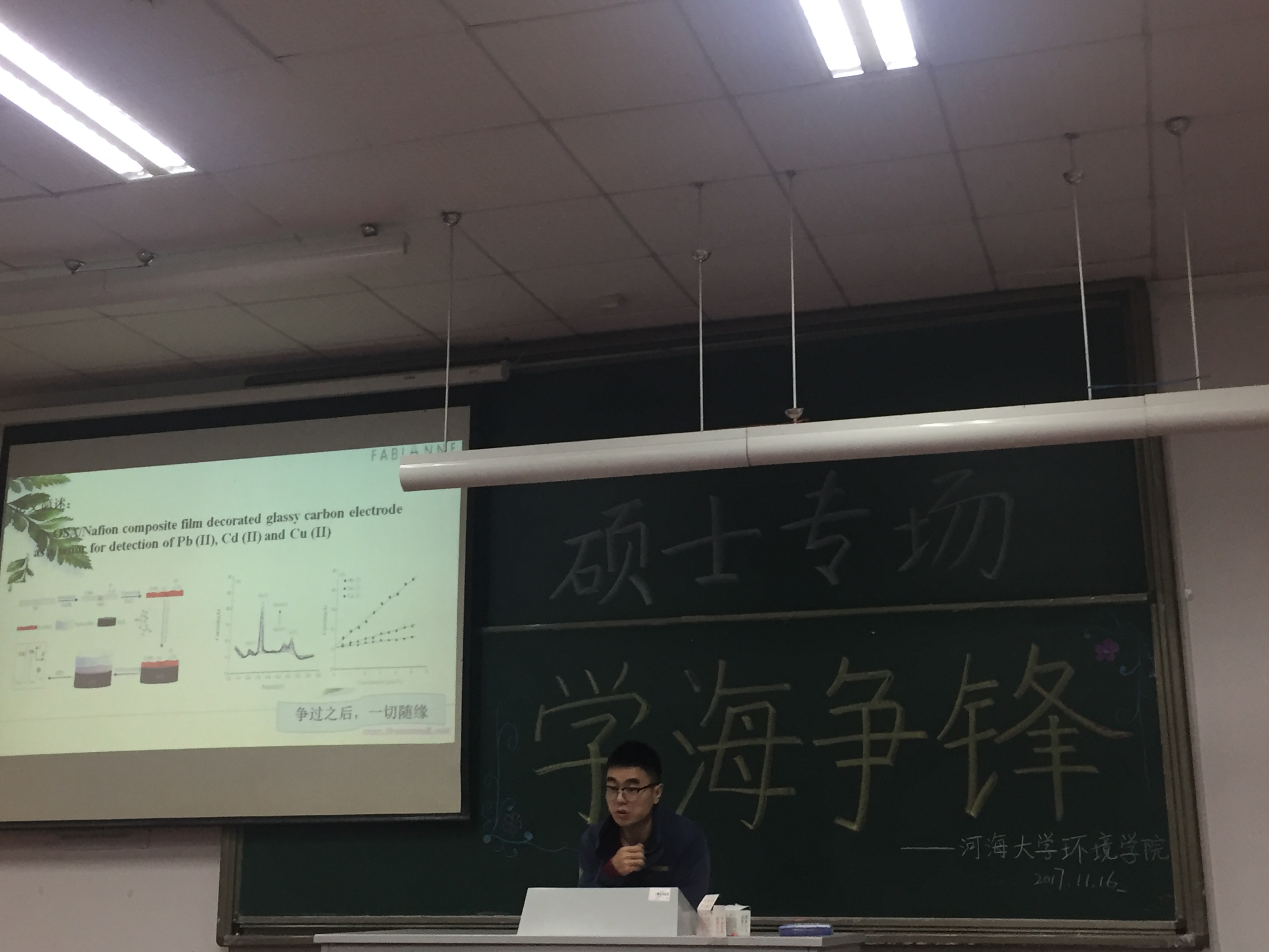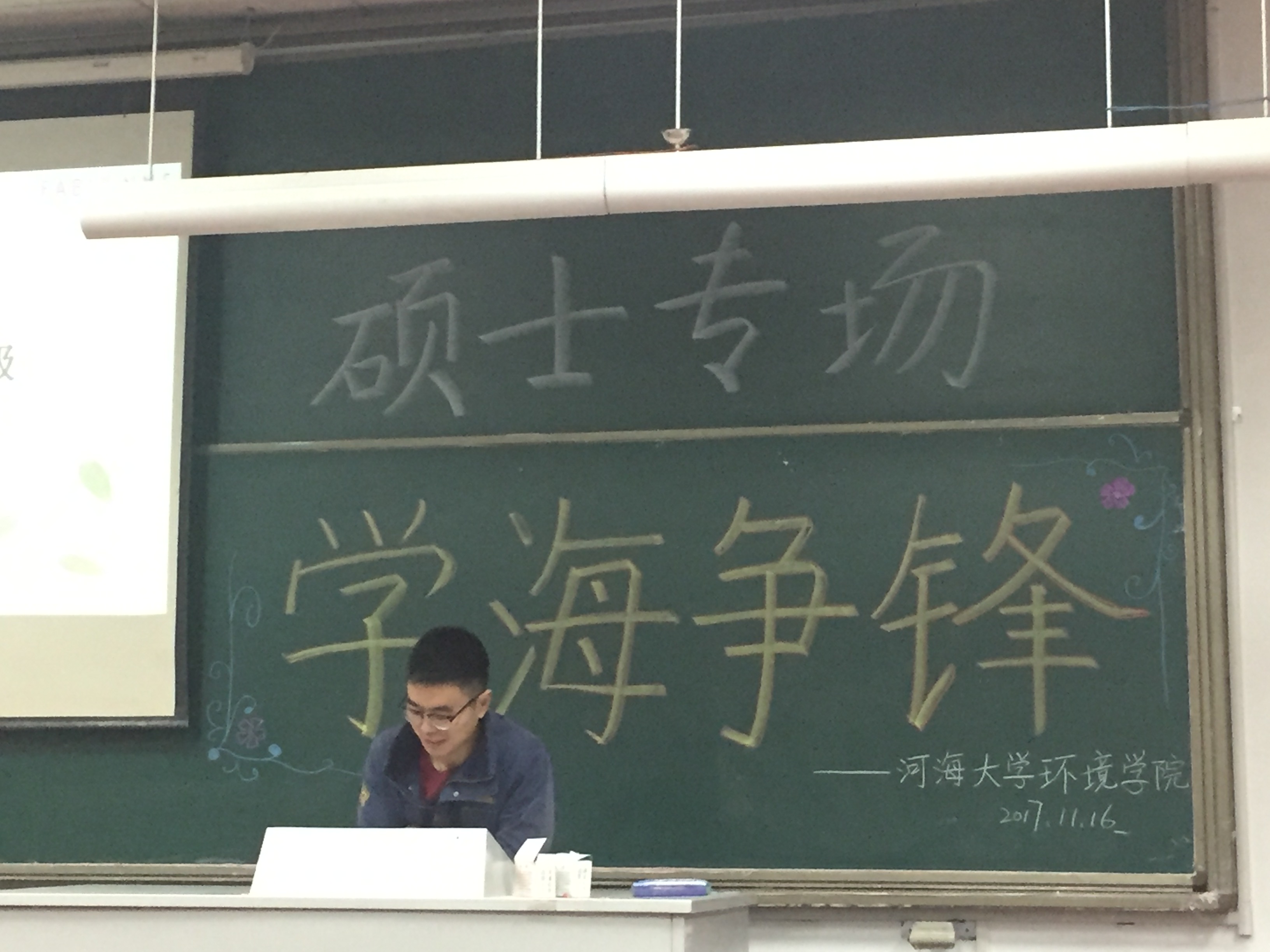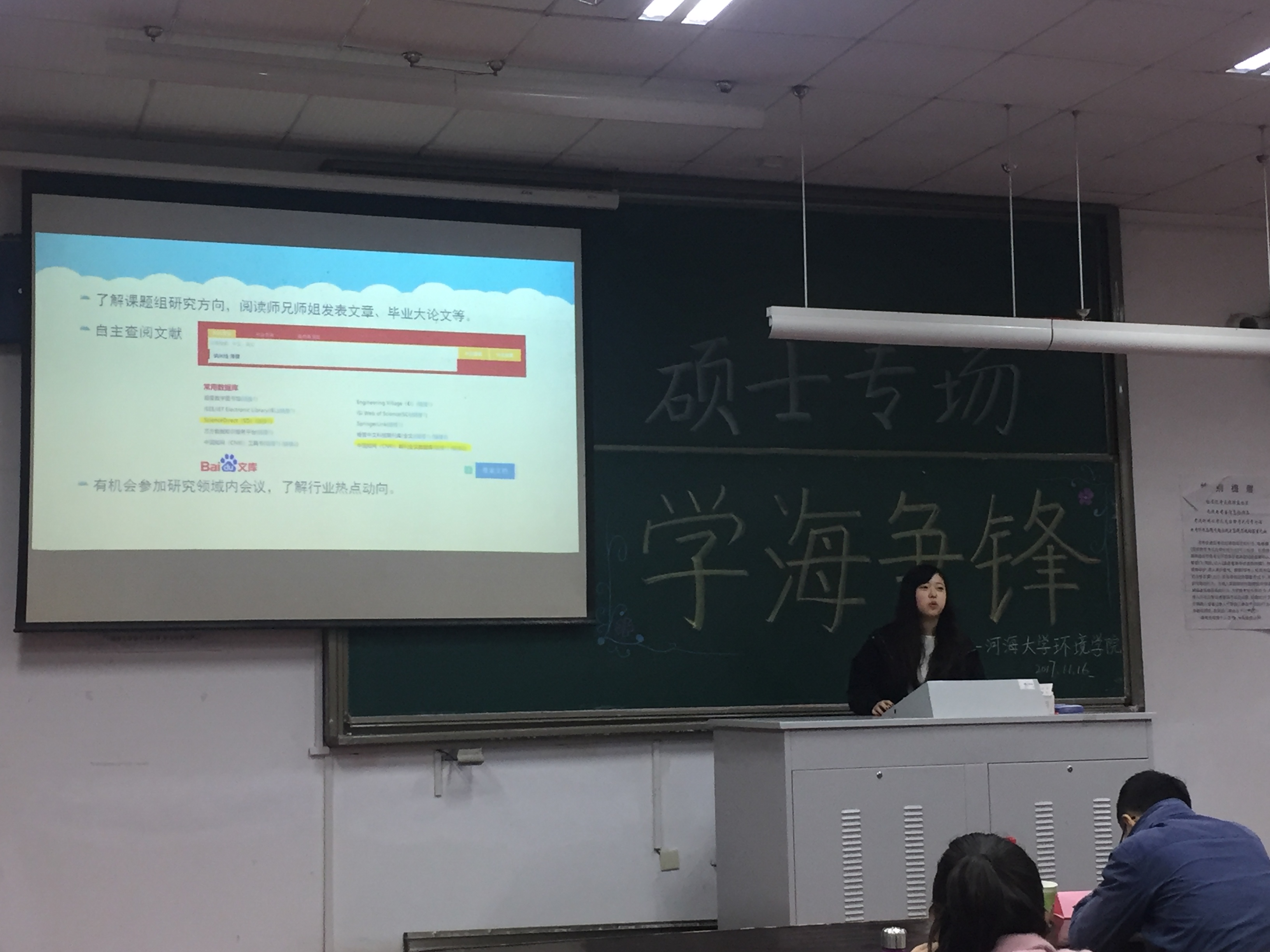 2017年11月16日下午,由91黑料 研会研科协策划并举办的“学海争锋——硕士专场”学术讲座于水利馆B101教室举行。本次讲座的三位主讲均是91黑料 优秀的研究生,都是今年国家奖学金的获得者,分别是16级市政工程专业的曹臻、15级市政工程的张佳男、15级环境科学与工程的沙海涛。
