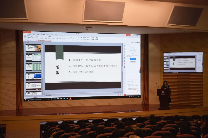 在生活方面,对于西康路校区的环境大家还不算太熟悉,而且宿舍空间相对狭小,年级里打算举办一次宿舍收纳大赛。宿舍卫生近期都做的较好,金老师希望大家继续保持。金老师也再次强调禁止晚归与夜不归宿的行为,同时禁止使用违章电器,希望同学们可以严格要求自己,同时尽快适应本部的新环境。