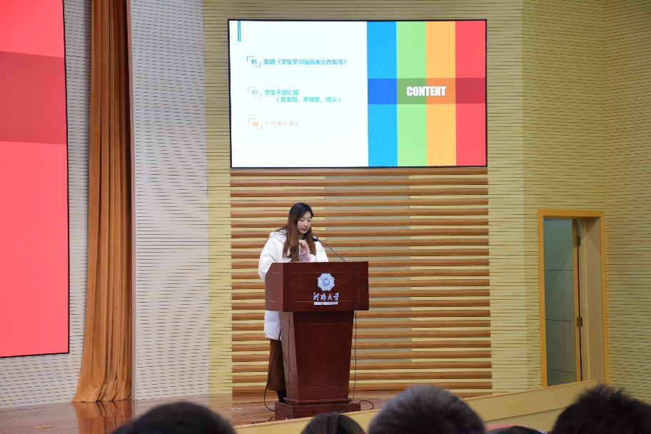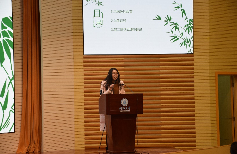 第三项是年级事务通告,辅导员金意倩老师进行了详细的汇报,主要是关于诚信应考、寒假时间、寒假实践、网课问题、避免校园贷等方面,金老师着重强调了关于避免校园贷的事情,并希望全体同学能够在寒假期间思考自己以后要做什么,提前做准备。