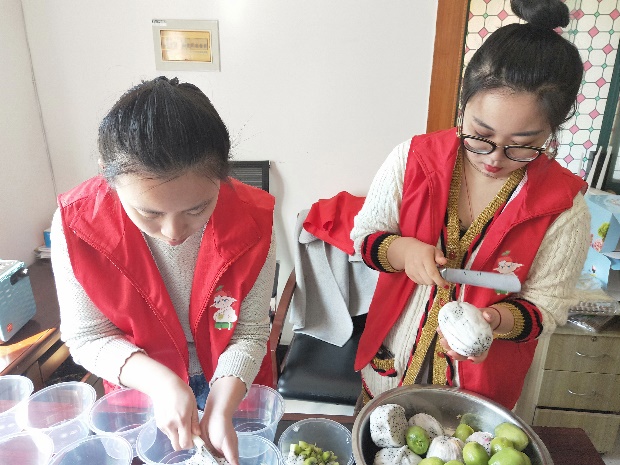 中午12点,志愿者们在学校东门地铁口集合,一起乘地铁到达了金港花园小区里的敬老院活动室。因为本次活动的主题是“美味蛋糕庆三八”,故而志愿者们稍做休息便投入到了活动的准备工作中。男生帮忙搬桌椅、贴横幅,女生帮忙铺桌布,一切井然有序。当工作人员把活动所需材料拿来后,志愿者们又开始清洗蛋糕用具、切分水果,为老人们的到来做好准备。