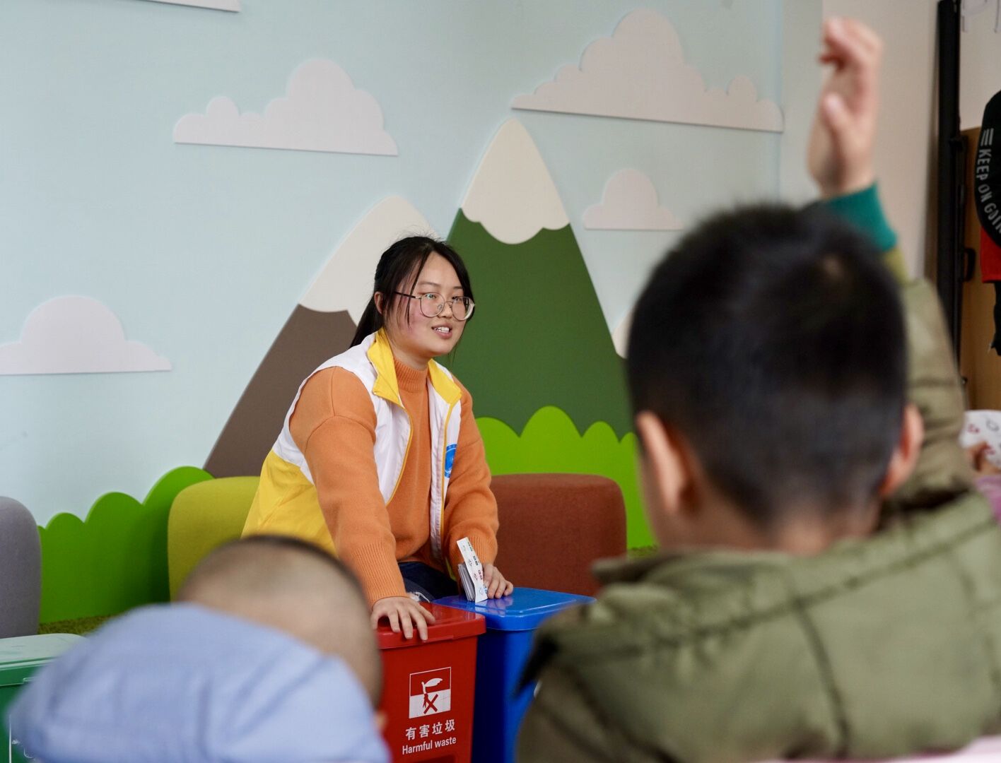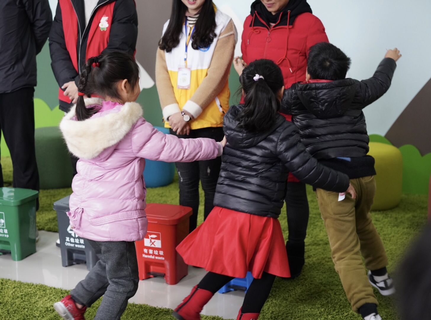讲解完毕之后为游戏环节。由志愿者和家长共同扮演垃圾分类的垃圾桶,小朋友们则需找到自己卡片对应的分类方式。志愿者大手挽着一双双小手,看着小朋友们把自己抱紧在怀里,也和孩子们一同欢笑起来。一轮轮游戏,一次次拥抱,也是一次次喜悦的传递。