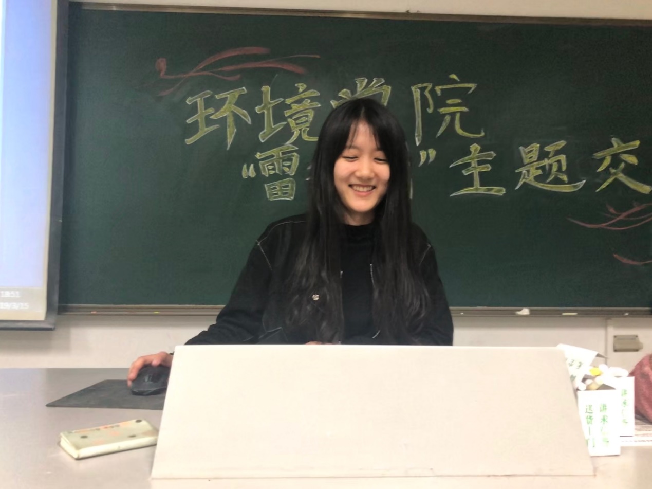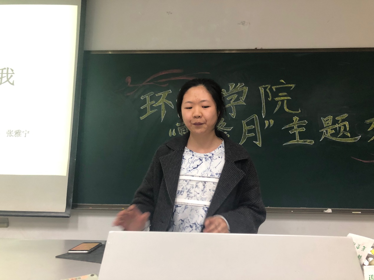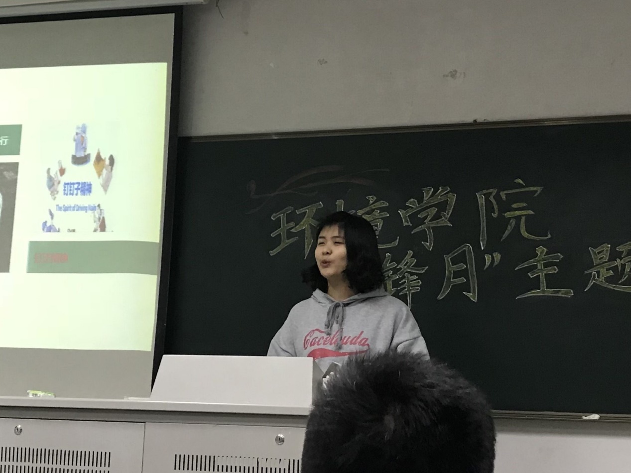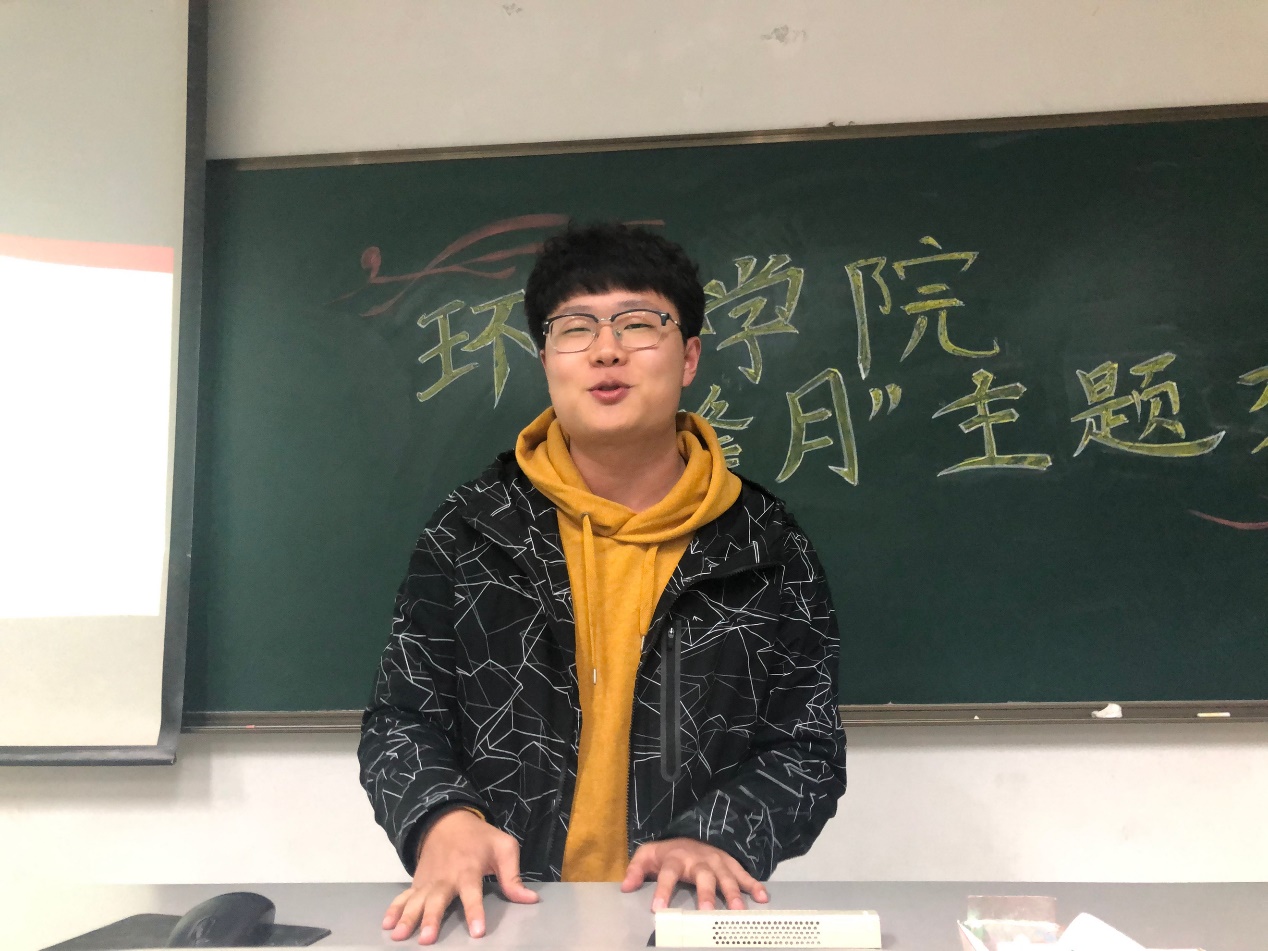 第二位是17级环境一班的王少伟同学。这位同学向我们详尽的阐述了暑期实践的意义和注意事项,令同学们收益颇深。首先是暑期实践的准备工作,同学们可以自主选题,尤其是可以选择一些对日后发展有益的活动。比如王同学选择了“海绵城市”这一主题,而海绵城市与生态环境息息相关。在实践过程中,王同学认为应当发挥雷锋的钉子精神,他在安徽省池州市(第一批进行海绵城市建设的城市之一)进行了调研,通过了解地表环境、使用材料异同、市政府对城市的环境规划、调蓄水池建设工程等,收集到繁杂丰富的数据。接着通过对信息数据的再处理,他使用直观的柱状图、饼状图以及数学建模的方式,向人们展示了该项目的成果。最后他将整个实践的成果进行了总结。