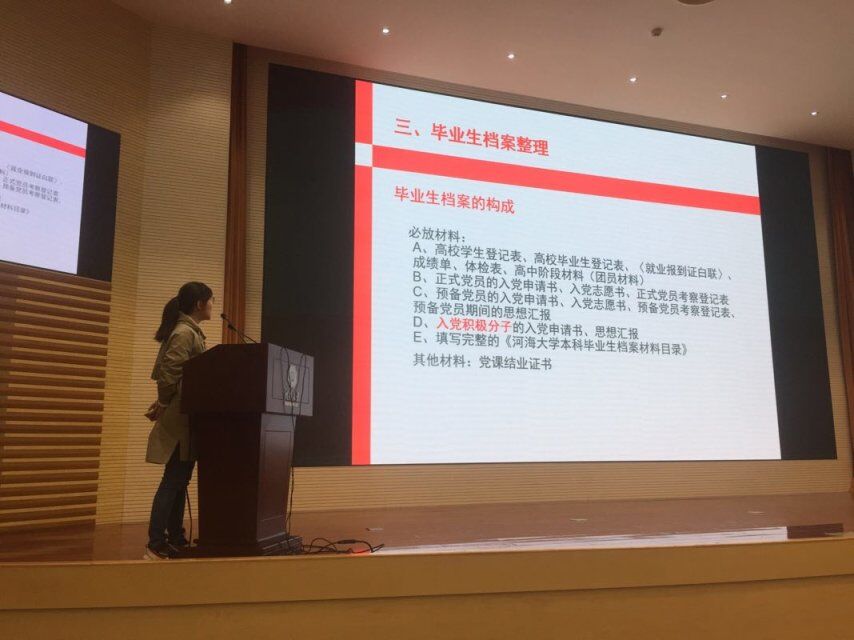 在大会上王剑老师主要从毕业生户口迁移注意事项,毕业生登记表填写要求,毕业生档案整理和报送流程,就业计划核对等几个方面为大家进行讲解总结,并以往年工作经验提醒大家重要的时间节点,同时希望大家自己对自己负责,注意重要通知,认真填写好每一份材料,确保能顺利毕业。