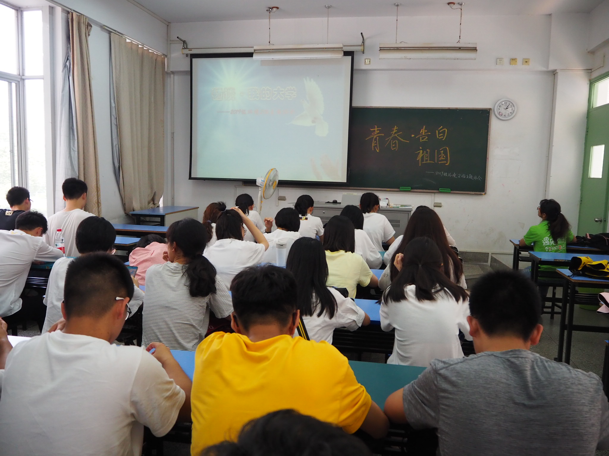 首先班助学导师结合各自在暑假中社会实践经历,讲故事、谈感受,向学弟学妹们讲授自己亲身感受到的祖国在各方面取得的成就,青春告白祖国。助学导师讲述结束后,邀请我们的新同学们结合自己家长的建设和改革变化,结合自己的成长经历、未来的目标志向,青春告白祖国。最后,新生以宿舍为单位向大家展示节目,增加了与同学之间的交流。