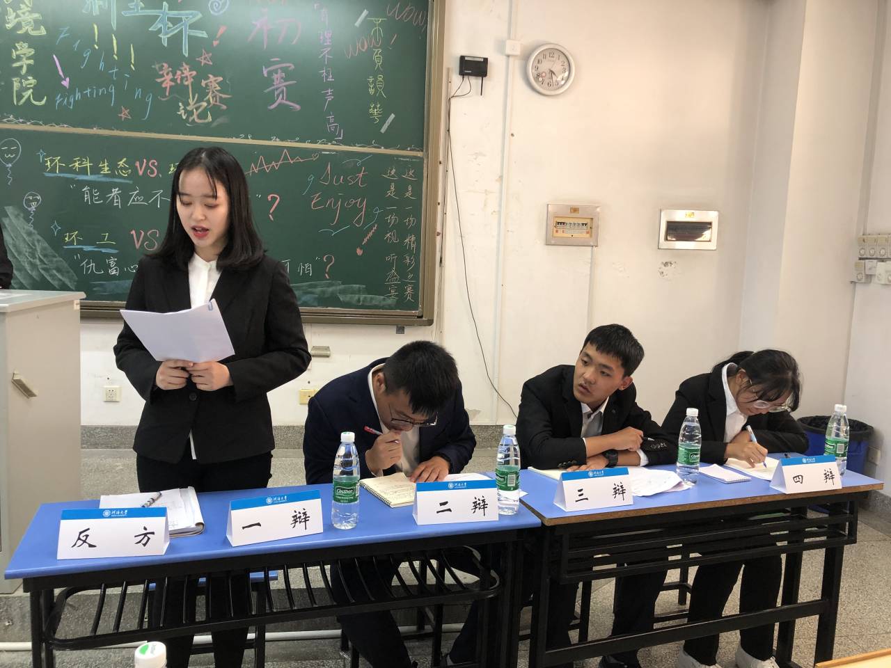 在主席的主持下,辩论赛正式开始。辩论赛第一场是正方环科生态联队与反方环境联队的唇枪舌剑。他们围绕“能者应不应该多劳”展开了激烈的辩论。正方认为,能者应该多劳,在某一领域能力相对较强的人,应在他所能承受的能力范围内应承担更多的责任。反方认能者只需做好本职工作,承担自己应尽的责任,而不需承担更多责任。双方围绕多劳与过劳的区别以及谁应该多劳展开了精彩的辩论,双方辩手你来我往,才思敏捷,又不乏风趣的比喻与例证。最终,经过一个小时的激烈比拼,评委们离席讨论,何杨副队长分别给正反双方做出点评,正方以3:2的比分获得了比赛的胜利。反方四辩凭借其优异的个人表现获得了本场比赛最佳辩手的称号,正方二辩凭借从容不迫的谈吐,获得最具风度辩手的称号。