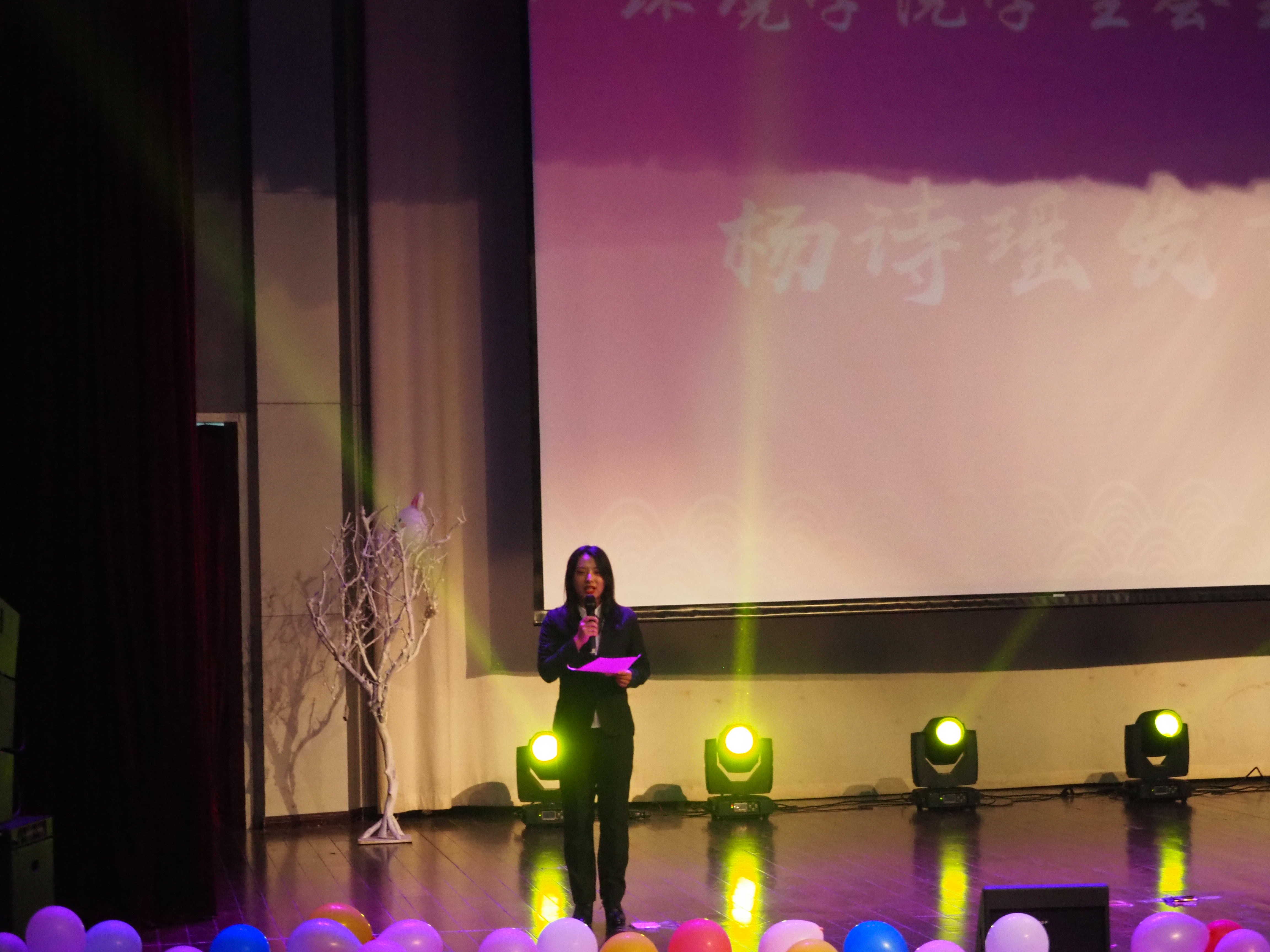 热场之后,主持人对出席晚会的嘉宾进行了简单介绍,2019级环境2班班导师李颖老师和生态1班班导师陈娟老师也上台发言了。两位老师表达了对本次晚会的期待,还向同学们送出了诚挚的祝福。此环节结束后,“境情直遂,环看今朝”迎新晚会正式拉开了帷幕。