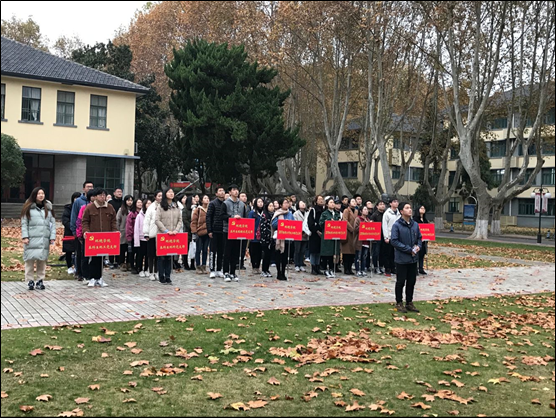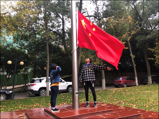 仪式第一项,升国旗,奏唱国歌,全体师生面向国旗行注目礼。此次升旗由雷晨雨和陈玲珑两位同志担任升旗手。虽然临近冬日,寒风扑面,但这冷风丝毫不减同志们的一腔爱国热情。伴随着慷慨激昂的《义勇军进行曲》,全体师生庄严地注视着国旗,高唱国歌,表达对祖国崇高的敬意。