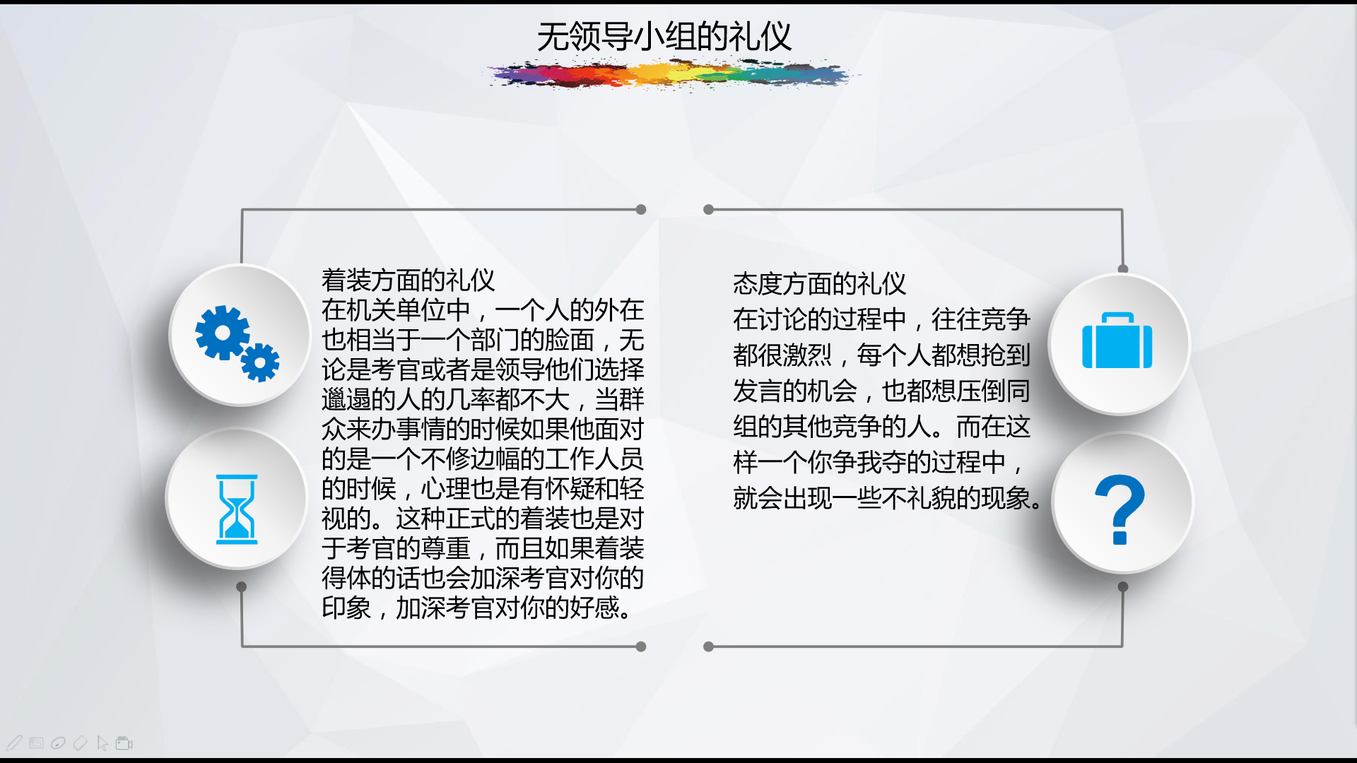 陈老师首先为大家讲授的是“无领导小组”的相关内容,旨在帮助各位同学顺利通过今后的各类面试。