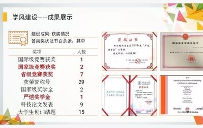 自制学习交流群,群内各类课件资源丰富。组成帮扶小组,且班委做到了严于律己,以身作则。绩点4.0以上人数11人,四级通过情况97%,六级通过率71%,计算机二级通过率46%,并有19人参加大学生课题创训训练项目班级学生获得校级及以上荣誉称号人数21人、校级及以上竞赛奖励人数25人、获得校级及以上奖学金56项,其中包含2项国家奖学金。