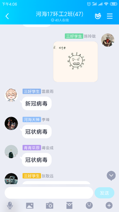 张亦驰同学说到“今年冬季,新型冠状肺炎疫情来势汹汹,世界均受到了波及,作为处于疫情曾是最严重地区的我感触颇深。国家迅速的封城应急响应、派遣专家团队均显示了对这次疫情战役的重视。火神山、雷神山医院建立彰显的“中国速度”都展示了日益强盛的国力。一方有难八方支援,从全国各地奔向武汉的医疗团队中不乏我们青年的身影,不畏艰险,舍生忘死,体现了“90后”青年的责任与担当。同为青年的我也响应了国家号召,待在家中减少外出,尽力不给国家添麻烦。疫情终将过去,春天必将到来。”