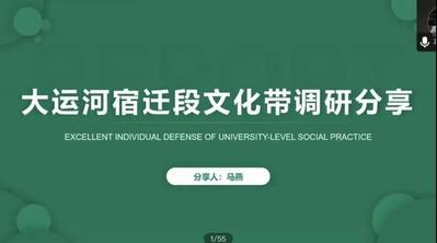 来自2018级给排水专业的马燕同学为同学们分享了自己“大运河宿迁段文化带调研”的实践活动经历。通过本次实践,马燕同学了解了大运河的文化及其起源,思考了运河文化与周边居民的关系,分析了大运河对城市的影响,同时也体会到了运河文化带的建设意义。
