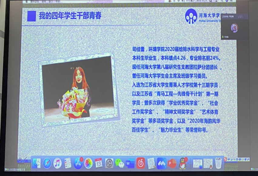 紧接着,参加了研究生支教计划的16级给排水专业司佳蕾在线上为同学们分享了有关研究生支教计划的经历与心得。司佳蕾从大学期间多参与社会工作的意义、研究生支教团的招募流程、选拔细则与保障机制等方面为同学们进行了详细的介绍。支教一年,自教一生。习近平总书记倡导的“青春绽放在祖国和人民最需要的地方”在司佳蕾的身上得到了很好的诠释。