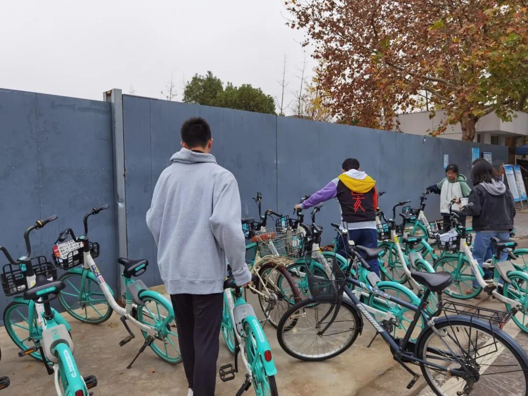 活动吸引了环境2班全员参加。同学们将校园中将倒下的共享单车扶起,将乱停乱放的共享单车摆放整齐、回归原位。经过将近两个小时的辛勤服务,一开始让人眼花缭乱的停车区变得井然有序。