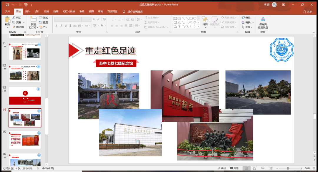 ★第十一组仅有两位成员,但二人的合作默契分工合理。她们的组名是“一眼千年”,从过去革命先烈的英雄事迹看向当今,再从当今看向祖国强盛的未来。答辩人在实践过程中切身体悟到红色革命征途的艰险困难,于是抒发了自己对于远征的看法。她认为只有在人生中历经一次次风雨后重整戎装再度前行,才是远征的含义所在。
