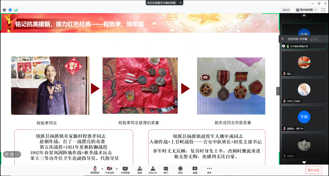 ★第三组(左图)将重心放在采访上,团队采访了抗美援朝的老兵及其家人。评委对这种调研方式称赞连连,同时提出一点小建议:可以把视频作为主要宣传载体,通过讲故事的方式使更多人了解抗美援朝,并接力红色经典。