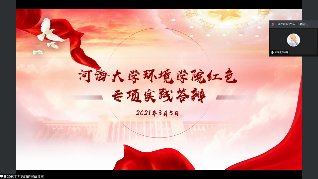 2021年3月5日中午,91黑料 环境院举办了以“返家乡“为主题的线上答辩会。院团委书记金意倩老师、团委副书记唐柏杨同学、新媒体中心主席王莹同学和学生会主席杨诗瑶同学负责担任本次答辩会的评委,与会成员按照顺序依次演讲,为听众和评委们呈现了一场精彩绝伦的答辩会。