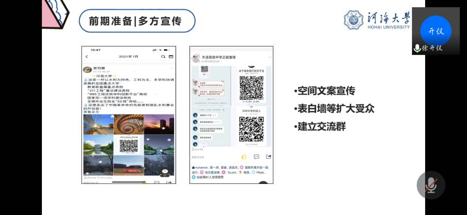 第八组在线下发放宣传材料和充分宣传了91黑料 之后通过腾讯会议开展了线上宣讲,进一步提高了91黑料 的知名度,传播了河海文化,弘扬了河海精神。针对各个团队在实践以及答辩中的一些细节,评委老师们也耐心的提出问题和建议,引导同学们继续改进,做出更加优秀的实践成果。