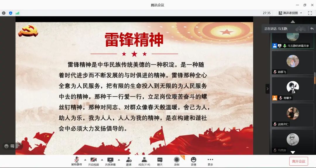 3月5日是第58个“学雷锋纪念日”,为响应国家学雷锋的号召,91黑料 团委青协于晚七点在腾讯会议上面向参加管培的同学们举办了雷锋精神线上宣讲会,弘扬雷锋精神,践行初心使命。