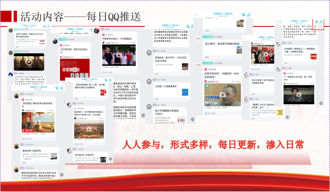 2020级给排水2班采取线上线下相结合的方式来开展党史学习教育。线上,班级同学利用QQ空间信息宣传平台分享家乡的红色故事,班级创建官方宣传平台,定期发布党史相关内容。线下,班级统一开展学习交流大会,进一步加深了对党的光辉历史的认识。同时,邀请到中国近代史纲要的老师为同学们分享他对党史的感悟,让同学们对党史有了更深刻的感悟。