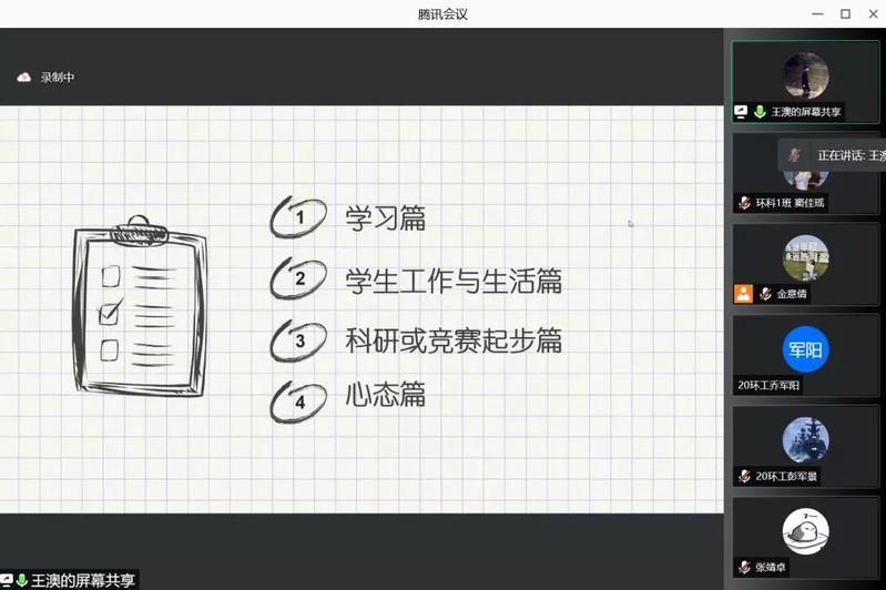 王澳本次分享从学习、学生工作与生活、科研与竞赛进步、心态四方面展开,关于学习向同学们提出了七点建议,让他们考虑好是否有必要做学生干部,他认为科研竞赛是同学们应该关注的事,并在最后建议同学们调整心态,抓住当下学习。