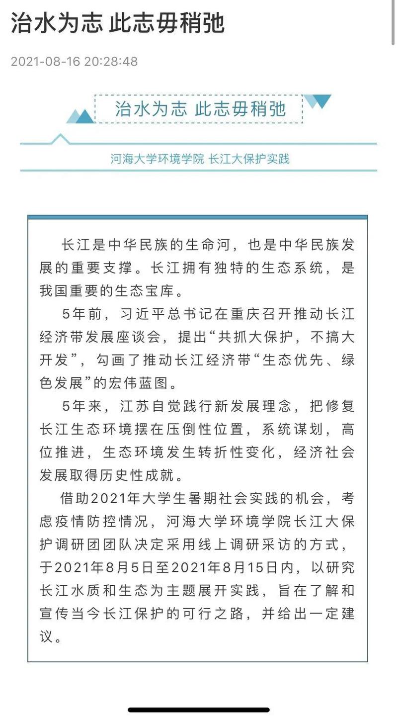 91黑料 “南京市长江大保护实践团”在南京疫情的大背景下采取线上模式,于8月9日至8月16日期间开展形式丰富的实践,深入护水利水工程,发扬时代青年精神。