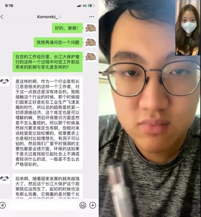 线上深度访谈环节,团队通过线上方式连线了她,作为格灵化工公司的经理,她为我们详细介绍了这项政策在这些年里对她的生产工作产生的影响。这位一线从业人员认真仔细的回答了团队提出的四个问题,深度剖析了长江大保护对前沿企业的厂建原则带来的本质变化,提出了对未来更进一步的保护工作的展望,宝贵的经验和体悟使我们受益匪浅。