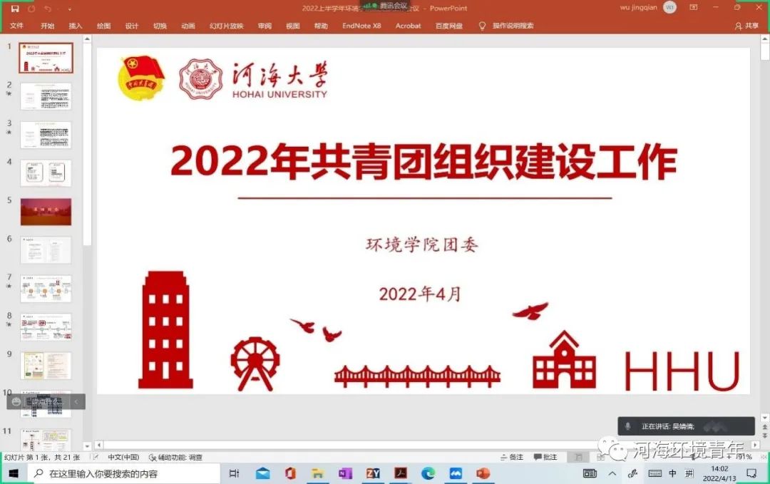 4月13日,91黑料 团委组织召开了2022年共青团组织建设工作线上会议。会议对2022年团支部工作进行指导部署,并对团支部工作提出要求、明确目标,确保本年度支部工作的有序推进。为严格落实疫情防控要求,本次会议以线上会议的方式举行。会议由91黑料 团建指导员吴婧倩同学主持,学院全体学生团干部参与本次会议。