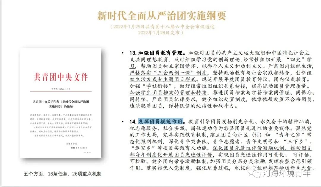 团建指导员吴婧倩同学深入解读共青团中央文件,文件强调了坚持不懈用习近平新时代中国特色社会主义思想武装全团,要求规范基层团组织建设、建强团的基层骨干队伍、提高团员发展质量、加强团员教育管理、发挥团员模范作用。