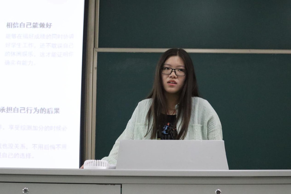 张世仪同学的分享干货满满,从四个技巧和改变认识两个方面入手讲解了如何科学提升绩点,又从四个不同的层面向同学们分享了如何协调时间的建议。最后,学姐向同学们提出了“目标清晰,量力而行”的建议。