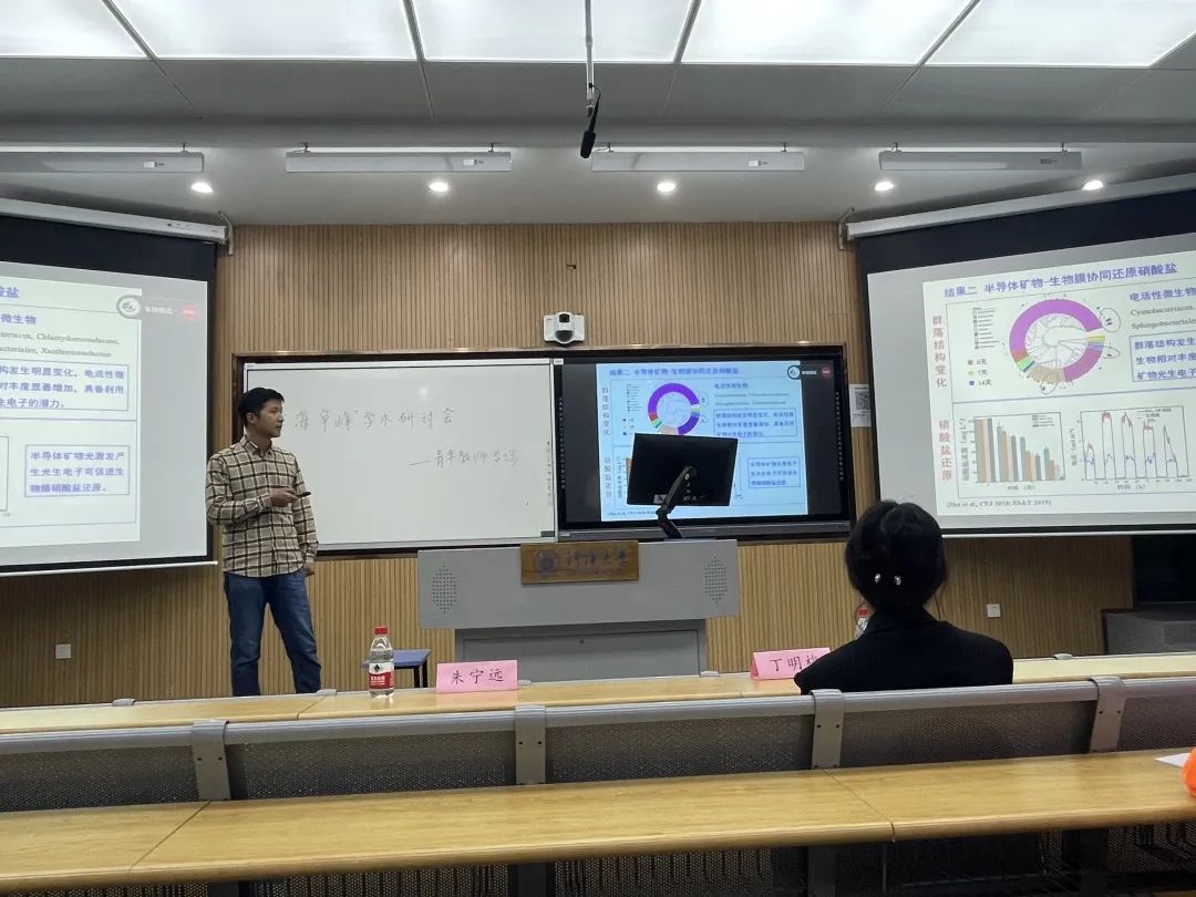 接下来与我们分享的的是2019环境与科学博士生杨梓俊。他以高藻水体为例与同学们探讨了植物酚基环境功能材料在水环境治理中的应用,并在最后分享了他做科研的几点经验。