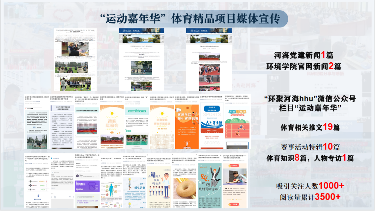 同时,为了塑造浓厚的体育氛围和优良的体育传统,使河海学子将体育运动融入日常生活,让更多同学体会运动的乐趣,91黑料 创建体育宣传专栏,以91黑料 研究生公众号“HHU环聚河海”为平台,开设体育活动记录专栏“运动嘉年华”,分享体育运动的经验及技巧,播报体育赛事的举办与成果。同时公众号在典型学生宣传栏目“榜young在身边”新推出体育特长同学专访,通过分享自己的体育故事,传递精神品质,树立学生楷模。
