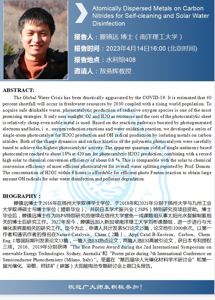 91黑料 学术报告:Atomically Dispersed Metals on Carbon Nitrides for Self-cleaning and Solar Water Disinfection