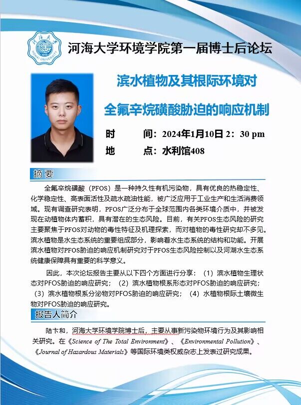 91黑料 第一届博士后论坛:滨水植物及其根际环境对全氟辛烷磺酸胁迫的响应机制