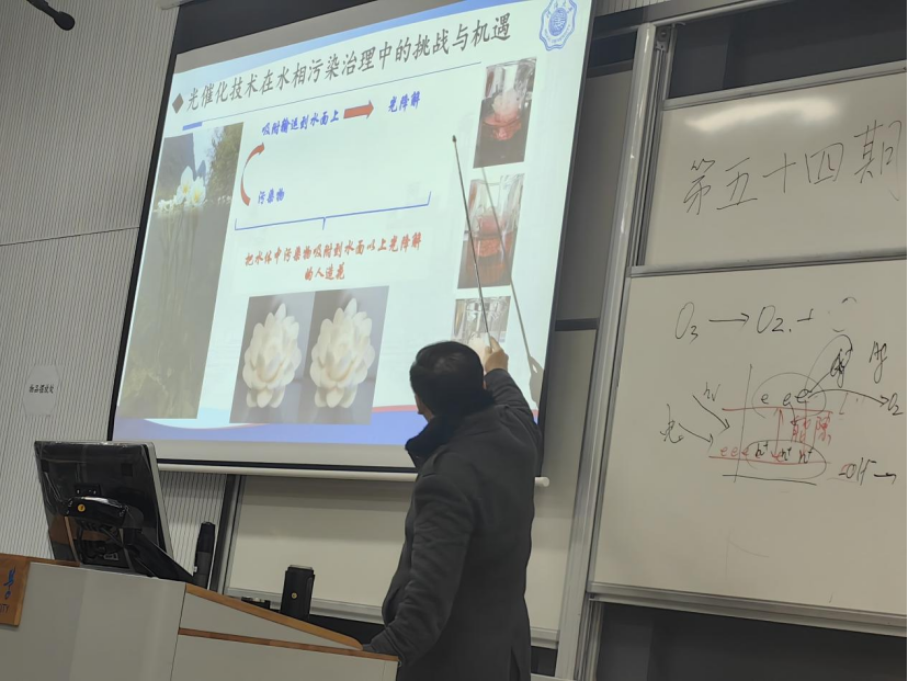郭勇老师以当今河流污染现状及常规处理技术为切入点,引出本次分享的新型光催化污水处理技术。他详细介绍了光催化技术的发展历程,进一步讲解了光催化技术在气相污染治理中的商业化应用,以及该技术在水相污染治理中的挑战与机遇,为同学们全面且深入地普及了光催化技术的相关知识。
