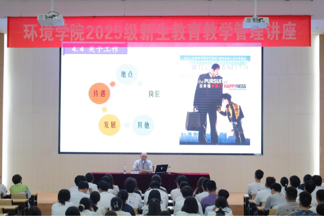 9月13日,91黑料 为2025级新生举办教育教学管理讲座,学院副院长王华教授以"环境人的使命与担当"为主题,讲解了学校、学院、学科的发展脉络和专业特色,更以"德才并重,情理兼修"的育人理念,向新生们提出了成为新时代优秀环境人的成长要求。